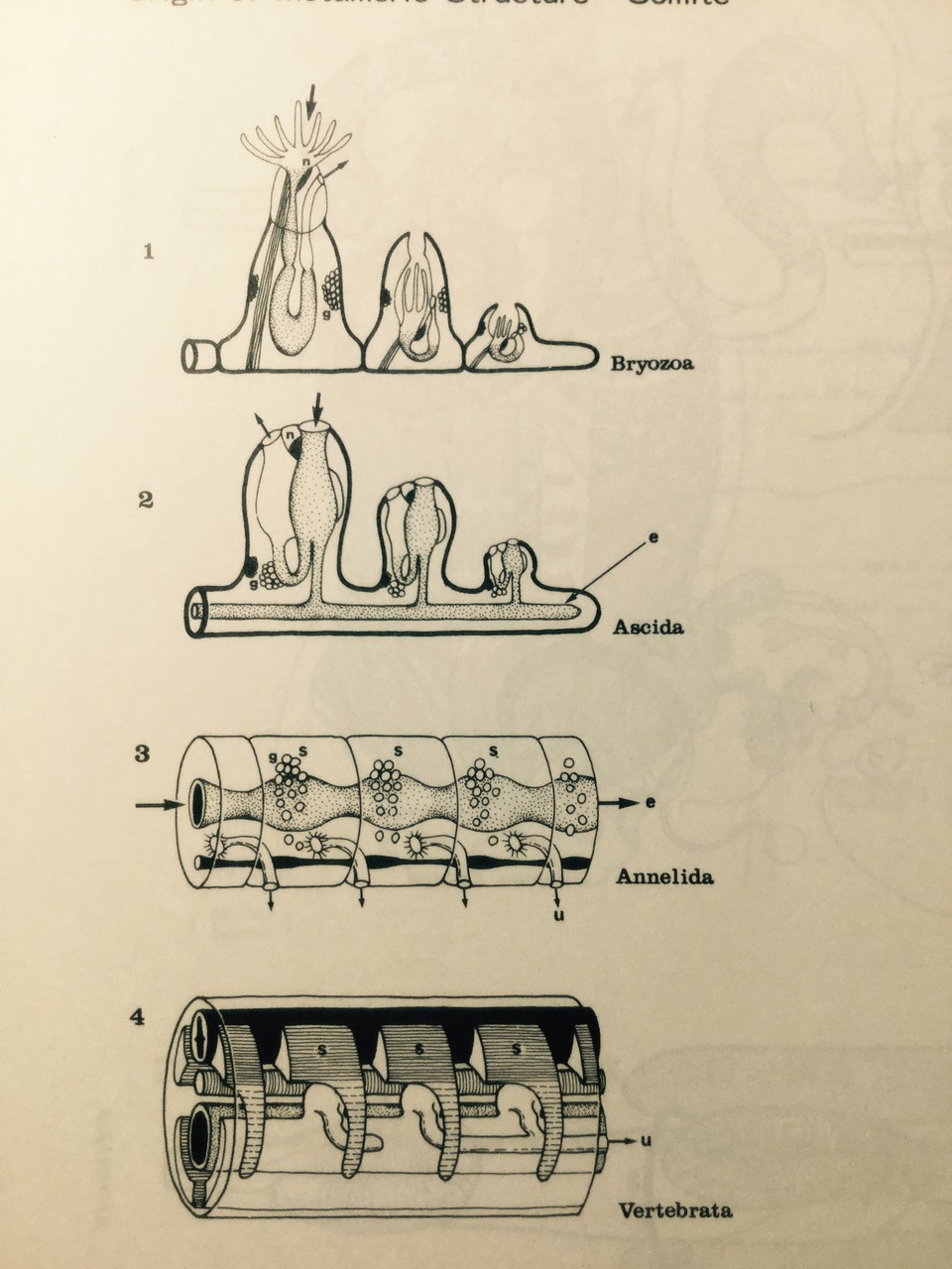 保守と進化の弁証法のもう一つの例が体節構造である。三木成夫氏は体節構造を下図の様に管クラゲやサンゴなどで見られる群体の「おもかげ」と見ている。するとそれは植物の「積み重ね」体制と動物の「はめ込み」体制の戦いと妥協の姿という事だ。