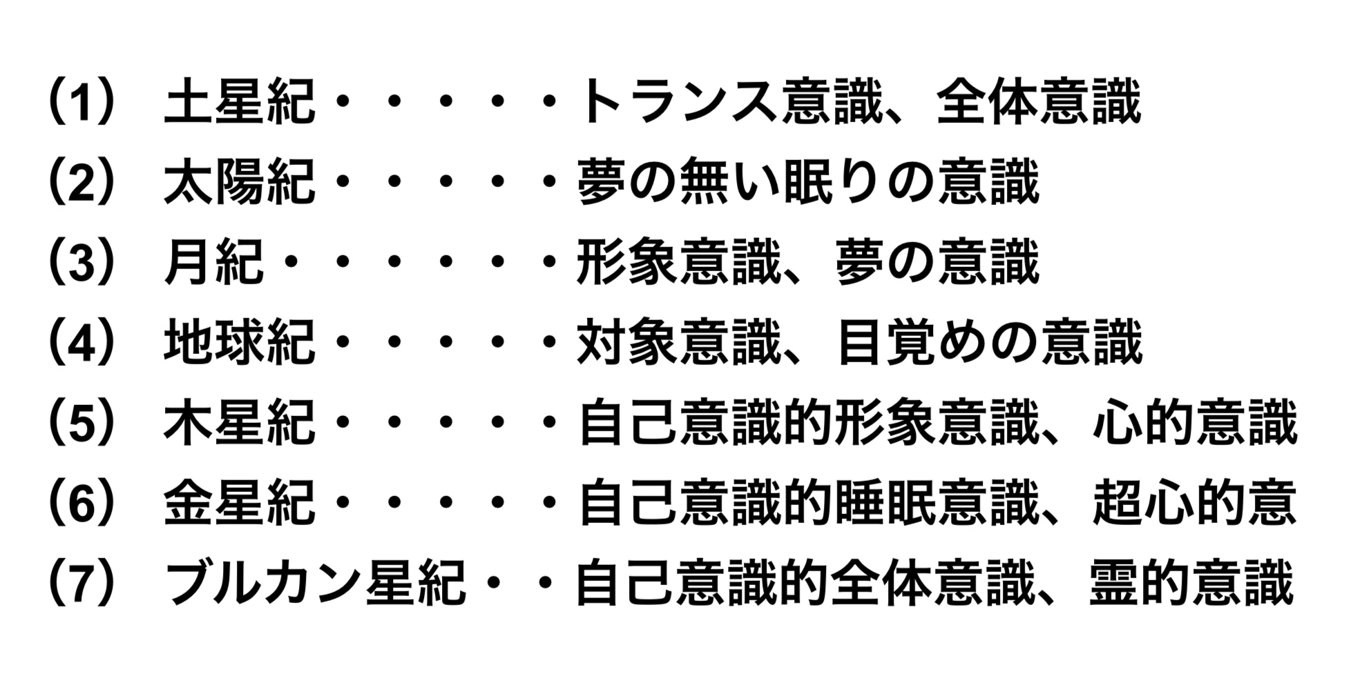 シュタイナーは星の転生を7つの時期に分け、それを人間の意識のレベルと対応させている。次のようなものだ。