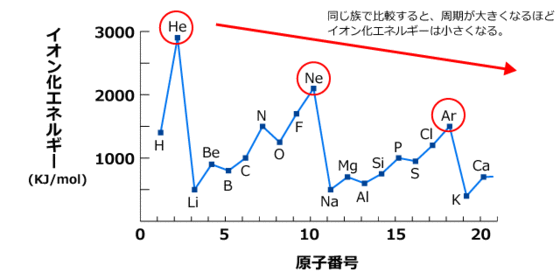 イオン化エネルギーは大きいほど陽イオンになりにくい。