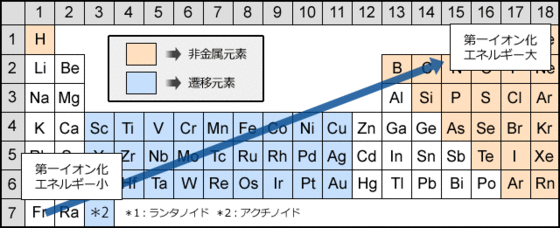 原子をイオンに変えるエネルギーは陽性元素の第1イオン化エネルギーと、陰性元素の電子親和力が大きく影響する。