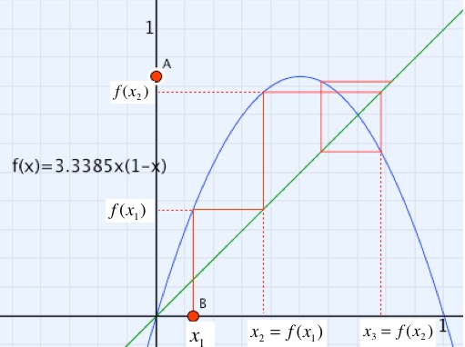 グラフに有る緑の直線は f(n+1) の縦座標から f(n) の横座標へフィードバックするためのf(n)=x(n) の直線である。