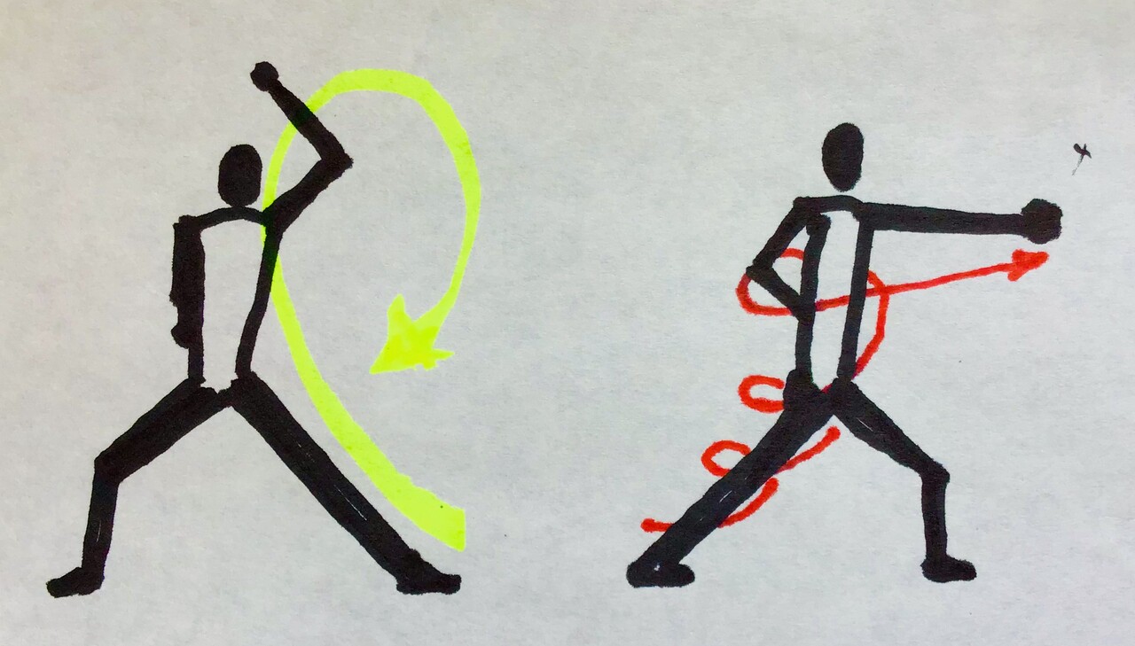 中国武術の纏絲勁は気の流れが加わるのでもっと複雑だ。先ず武術で最も単純な纏絲勁と思われる回し受け逆突きの図を見てみよう。(前に説明した後屈〜前屈式である。)