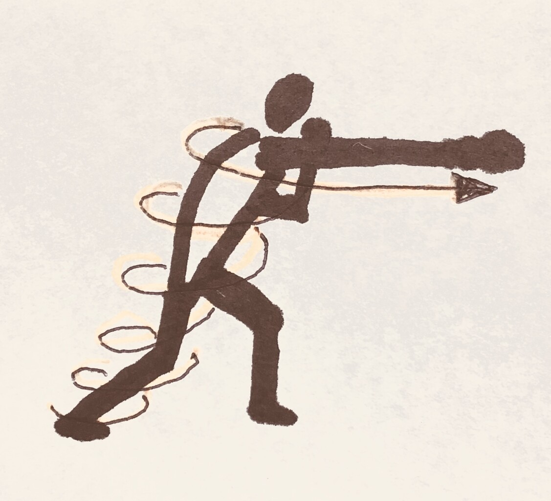 そして纏絲勁は上右図の赤線の様に後足から発して左回りに回転しながら腰から肩へと上がり腕から拳へ出る。これはボクシングの右ストレートと似ているが、後足の膝を伸ばし踵を着ける事で大地の力を借りる点が異なる。