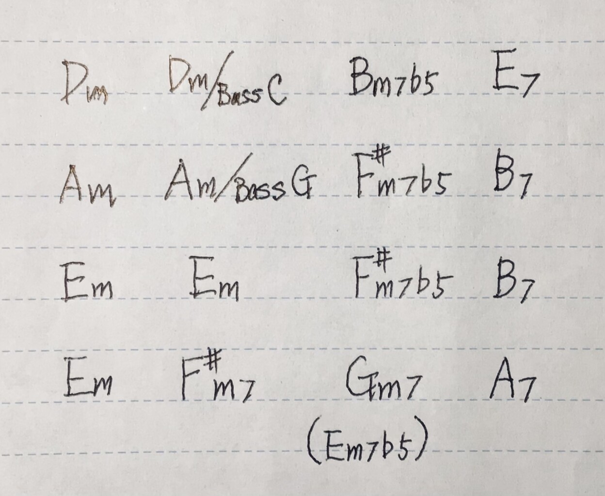 追記:この曲のコード進行の美しさを知ってもらうためにCmからDmのキーに変えて大まかな進行を書いた。