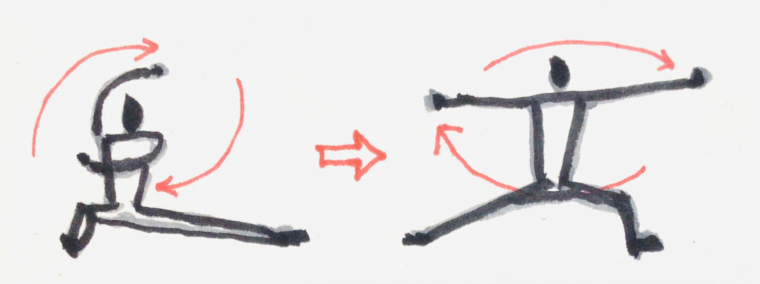 この様に回転する気流の場を想定する事により、分かりにくい中国武術の套路(空手では型)の動作の意味が分かってくる事がある。