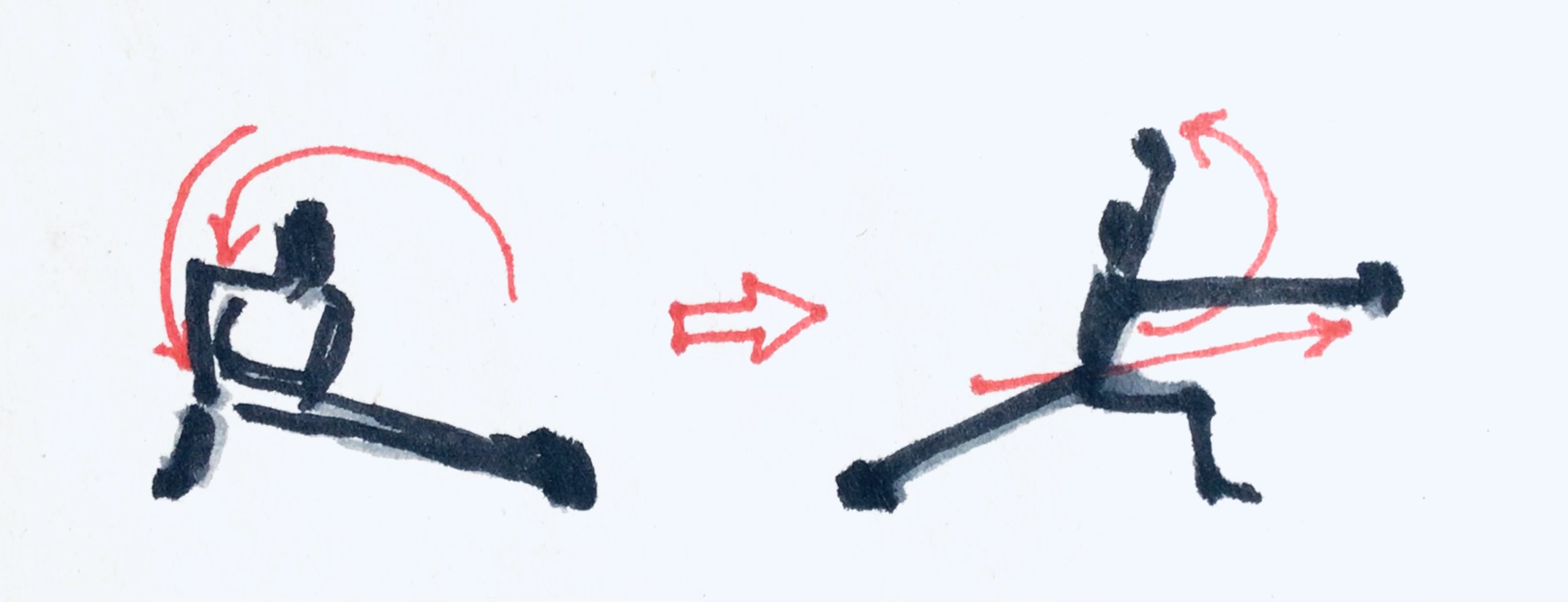 これと対照的な動きをするのが初級長拳三路にある「大躍歩前穿」と呼ばれる動作である。