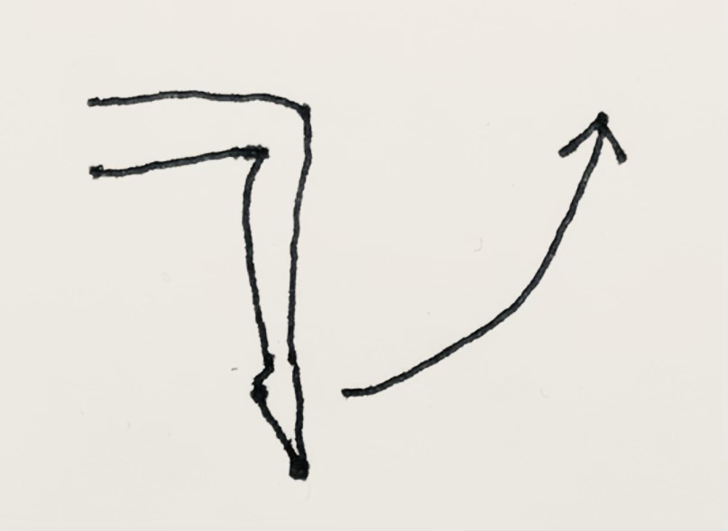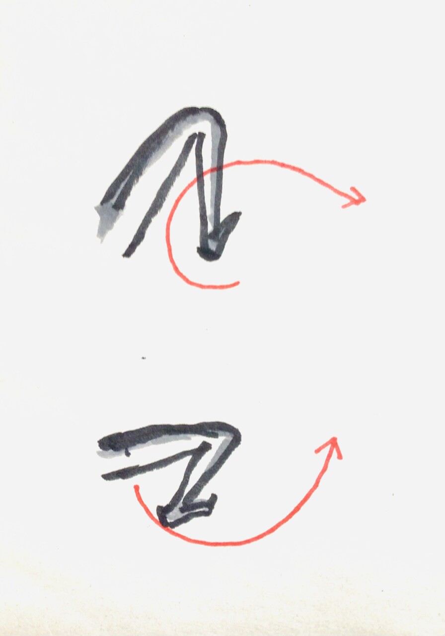 ムエタイ前押さえの車輪方向の回転では膝を上げるまでは「蓄勁」なので吸気し、膝を伸ばす過程で「発勁」となるので呼気するのが気功的には合理的だ。(下図左)それに対し車輪と逆回転の弾腿では初めから呼気しながら一気に蹴るのが合理的である。