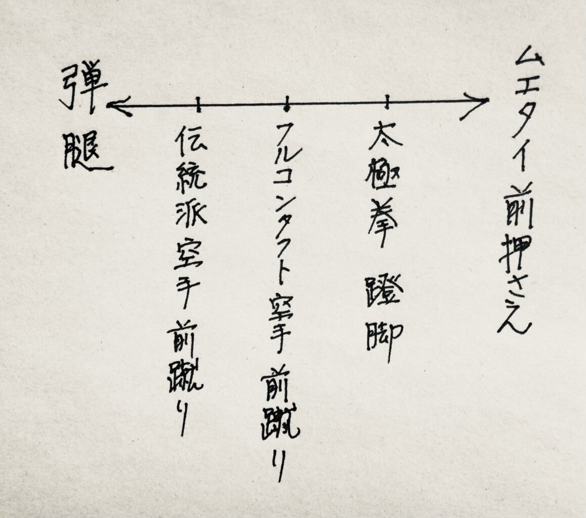 それに対し古式ムエタイの前押さえは車輪方向に回る力が働いている。この二つを両極として太極拳の蹬脚、伝統派空手の前蹴り、フルコンタクト空手の前蹴りを位置付けると下の様になると思う。