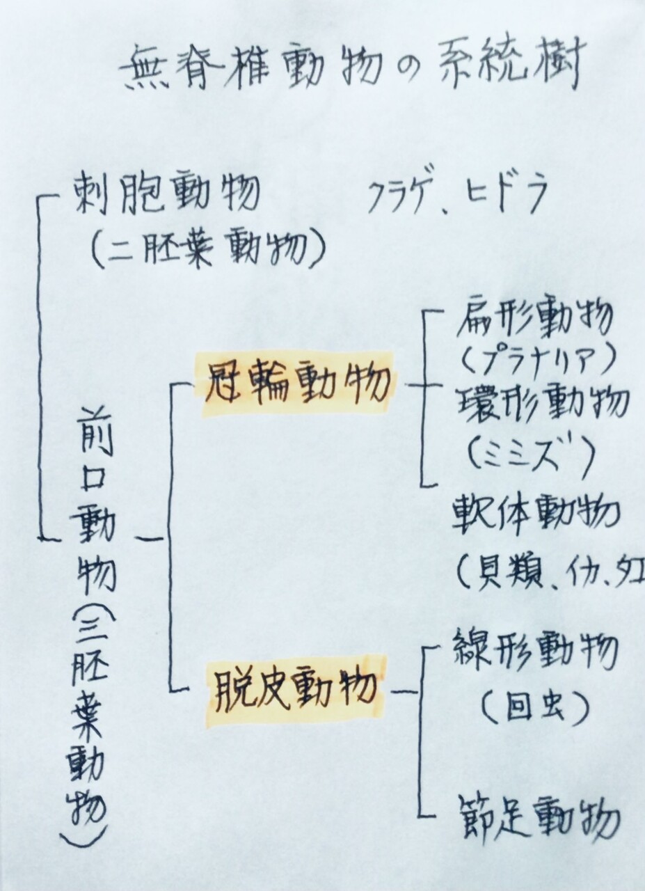 無脊椎動物全体の系統樹も書き換えられてきている。軟体動物と環形動物、扁形動物は三種ともトロコフォア幼生を経るところから冠輪動物と呼ばれ、節足動物と線形動物はどちらも脱皮する生活から脱皮動物と呼ばれるようになった。これも細かい部分は省略して示す。ミミズのような環形動物は体節を持つところから節足動物の原始形と見られていたのが、節足動物より軟体動物に近い事が分かったわけである。