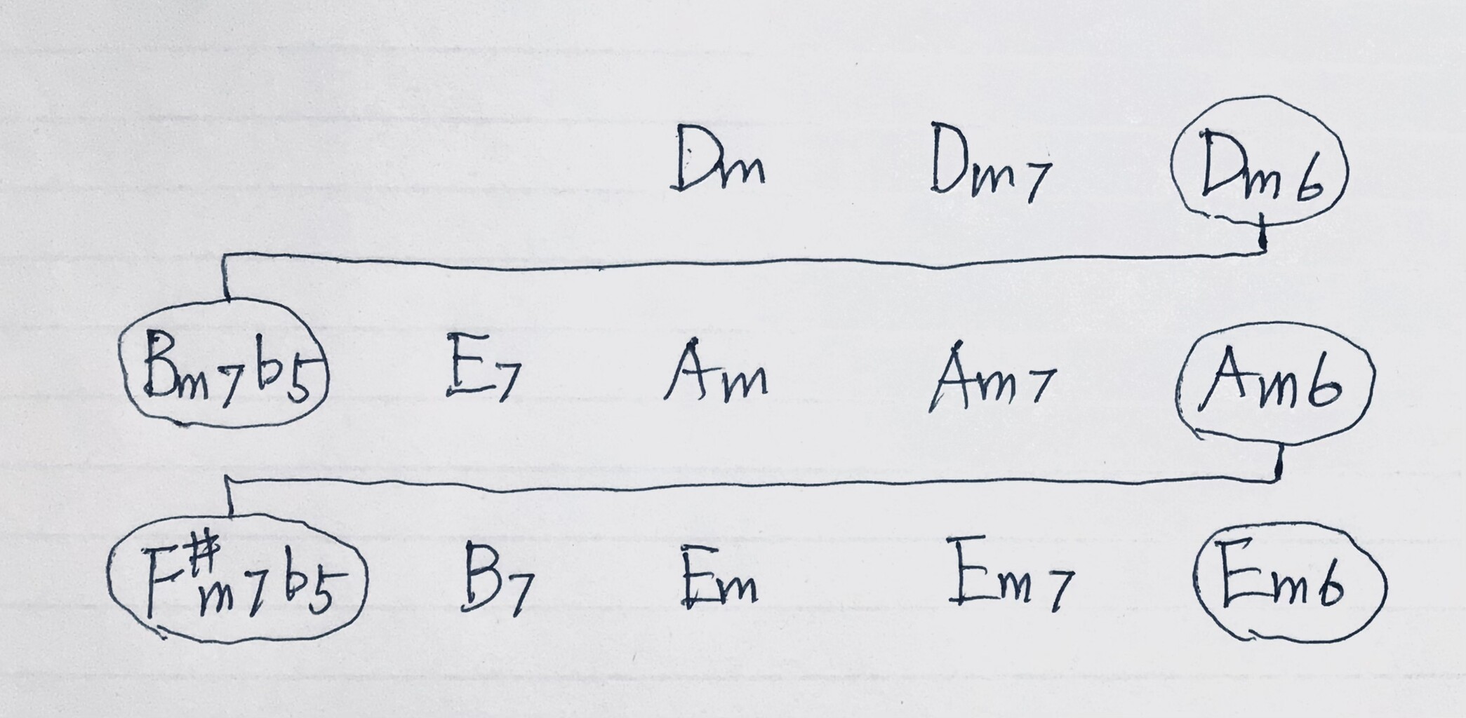 ベニー・ゴルソンの「Dear Kathy」は上図の様に Dm6(レファラシ)をBm7♭5(シレファラ)と見做す(線で繋いだコードが同じコードの転回であるから同じと見做す)事で次々と属調に転調していく。