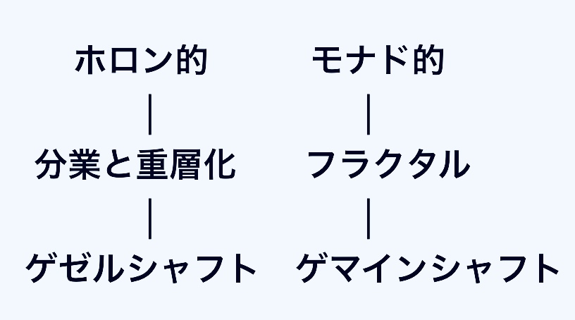 中間のホロンは下層から見れば全体であり、上層から見れば部分である。生物でも社会でも分化(分業)が進むほどフラクタル性は失われていく。ただしゲマインシャフトにも階層構造はあるのでその辺をもっと理論を詰める必要がある。