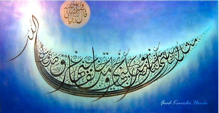 本田氏は初めは「書法を守らずに書いているから全然駄目だ」とダメ出しをされた事もあったらしいが、そんな厳しい世界で何十年も研鑽を続け2000年には師匠のトルコ人書家、ハッサン・チェレビー氏から免許皆伝を認められた。上のは本田氏の作品で「青の方舟」と題されている。