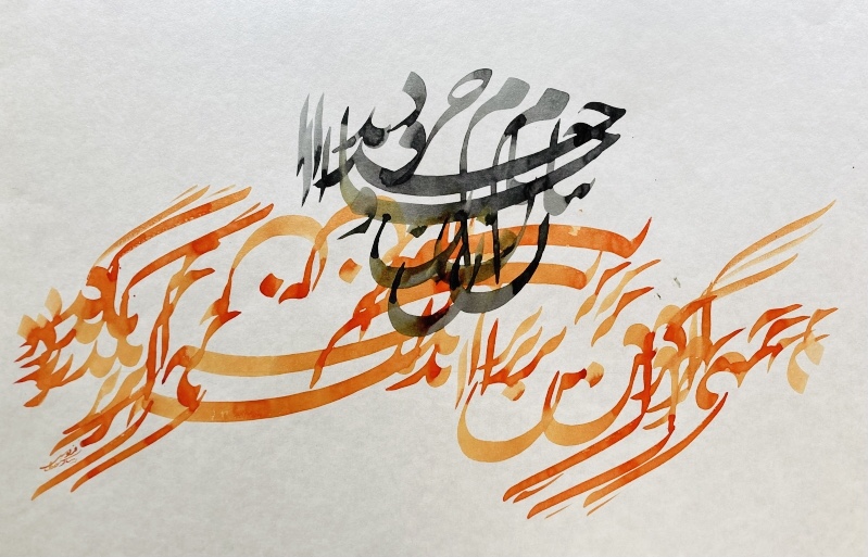 一方ペルシア書道はアラビア書道の影響を受けて成立したらしい。 ペルシア書道の日本における第一人者、角田ひさ子氏は大学時代にペルシア語を勉強する内にペルシア書道に出逢い、通信教育で習った後、イランへ留学して現地で直接指導を受けた。