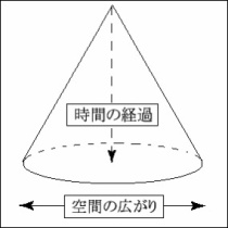 ここで意地悪な半田氏は(失礼!)「次元観察子ψ」(プサイ)という難しい言葉を使って説明をワザと難しく、おっと失礼、分かりやすくしてくれている。一番上の円錐はψ1、2番目の逆向きの円錐はψ2、3番目の重なった円錐はψ1とψ2の統合なのだ。半田氏によれば、ヌー ...